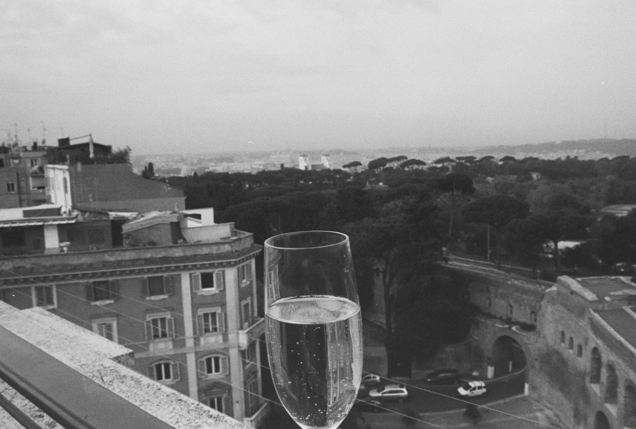 A glass of prosecco and a view from my hotel balcony on the Via Veneto at the Grande Albergho Flora.